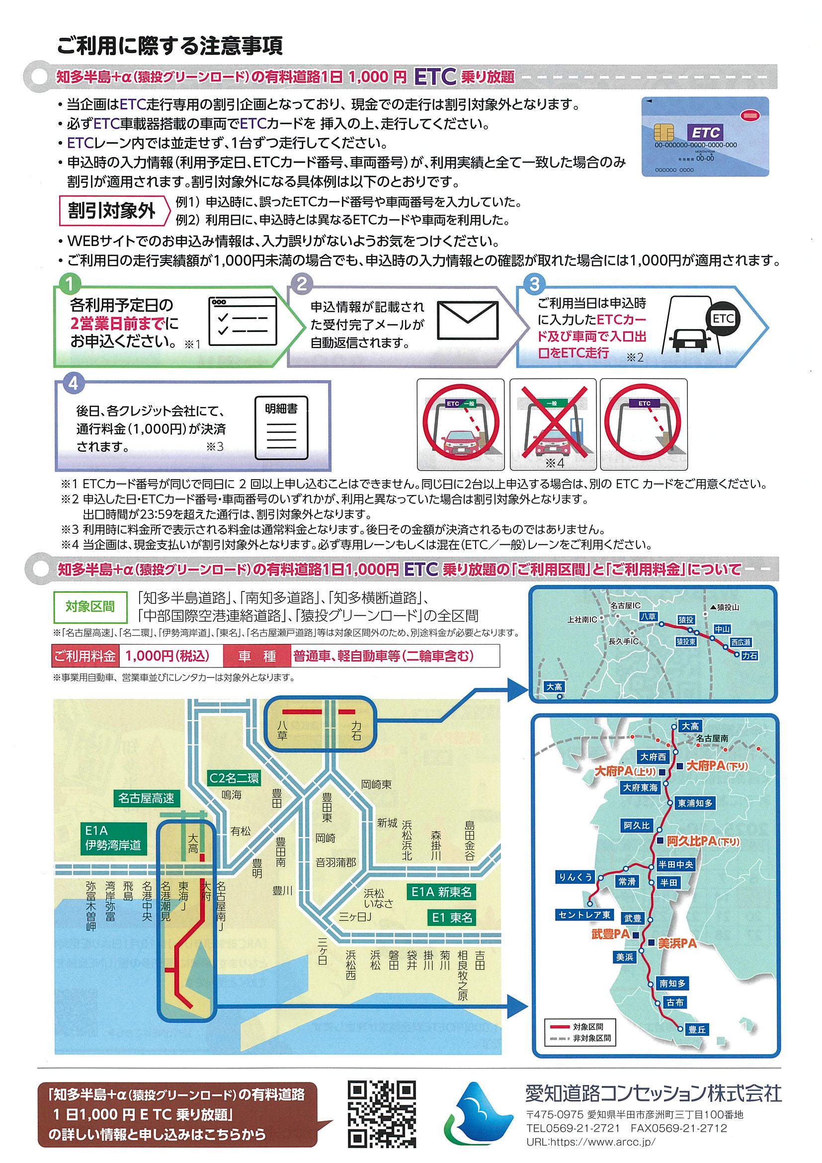 「知多半島+αの有料道路ETC乗り放題」とは、愛知道路コンセッション株式会社が運営する対象路線をETCのご利用と事前の申込により、定額で1日※1乗り放題となる通行料金プランです。ご利用に際し、ご注意いただく点がございますので以下の事項をご確認のうえ、お申込みください。(※1 1日とは、ご利用日の0時から同日23時59分(出口通過時間)までとなります。)