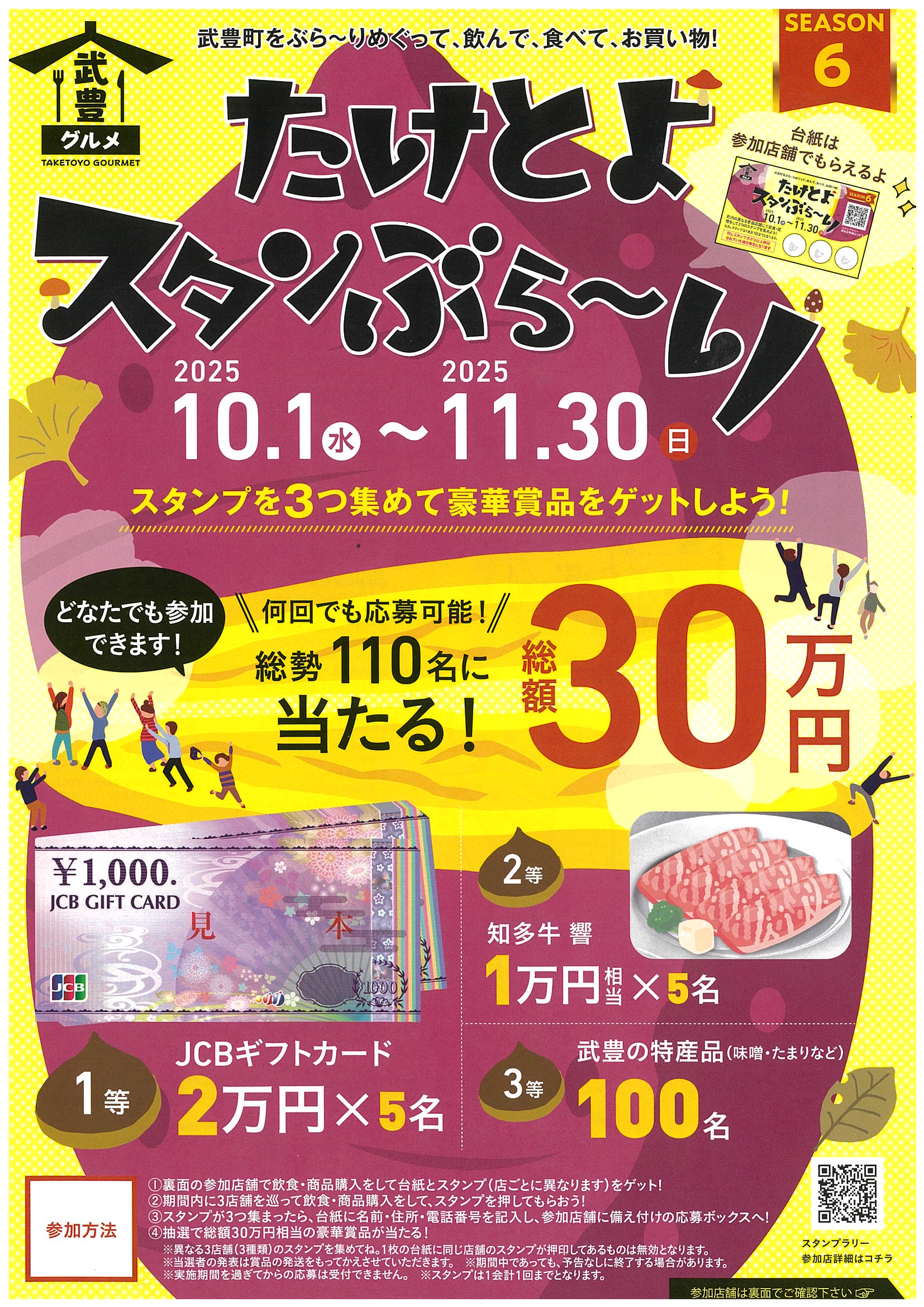 武豊町内の参加店舗で飲食、商品購入をして台紙とスタンプをゲット!期間内にスタンプが3つたまったら、抽選で豪華賞品があたります。