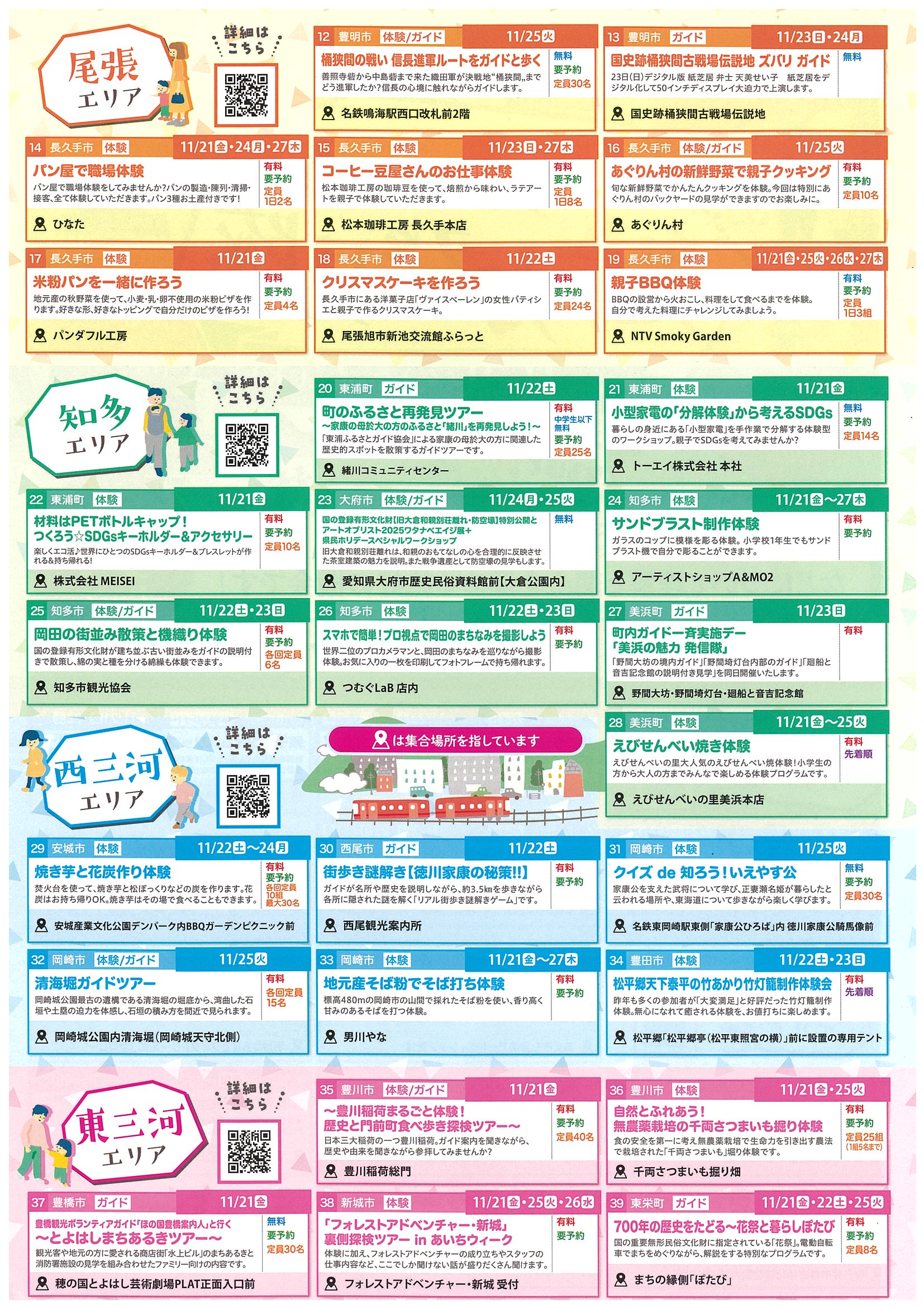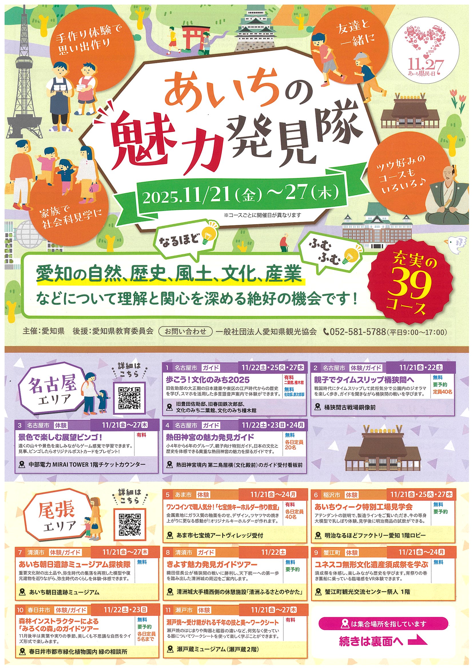 愛知県では11月27日を「あいち県民の日」として、27日を含む直前の1週間(11月21日から27日まで)を「あいちウィーク」と定め、期間中、県内各地で様々なイベントが開催されます。この一環として、「あいちウィーク」期間中に、愛知の自然・歴史・風土・文化・産業などについて理解と関心を深めることができる、県民向けガイドツアー「あいちの魅力発見隊」を39コース開催します。お子様と一緒にご家族でのツアー参加はもちろん、お一人や友達との参加も可能です。この機会に、ぜひ愛知の魅力を発見してください。