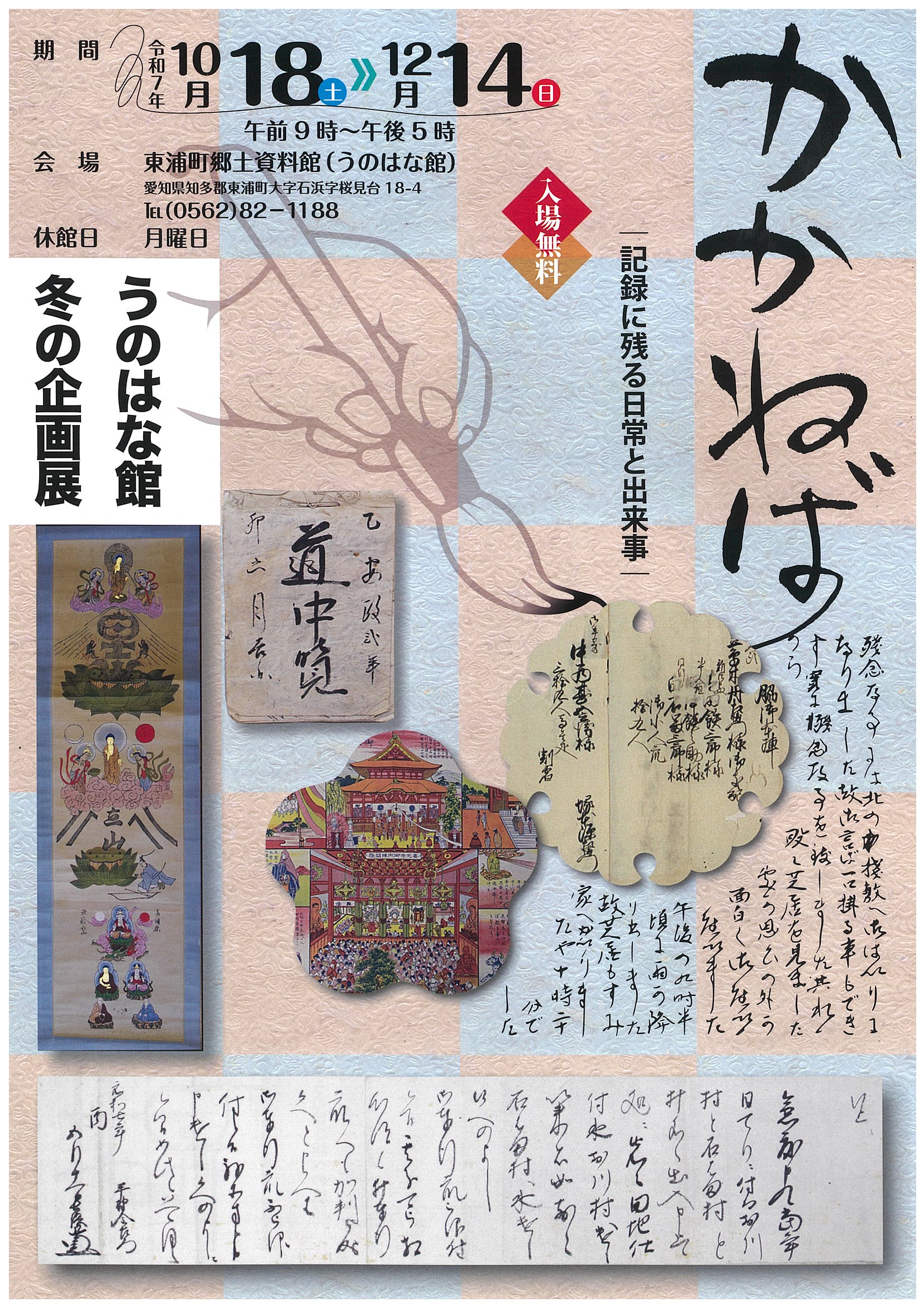 江戸時代から昭和にかけて東浦で暮らしていた人々の生活や寺社の日常は、日記や記録などから知ることができます。簡潔に記された寺社運営や災害、旅の記録、また水争いなどの生活を守るために大切に守られてきた地域の記録を取り上げ、東浦の人々が残した日記や日誌を中心に、当時の日常生活を覗き見しつつ、ちょっとした出来事を紹介します。