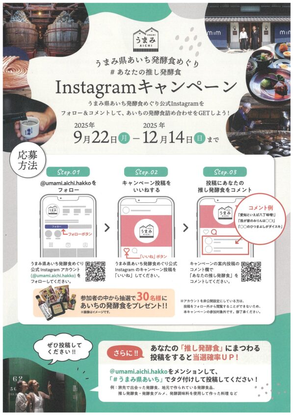 ①うまみ県あいち発酵食めぐり公式Instagramアカウント(@umami.aichi.hakko)をフォローしてください。